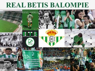 El documento resume la historia del Real Betis Balompié, un equipo de fútbol español fundado en 1907. Detalla sus primeros años, su edad de oro en la década de 1930 cuando ganó la liga española, su descenso a tercera división en 1947 y su resurgimiento en las décadas posteriores, incluyendo ganar la Copa del Rey en 1977 y 2005. También menciona su estadio, escudo, jugadores importantes y su apasionada afición.