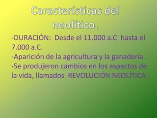 El documento describe la era del Neolítico, que comenzó alrededor del 11.000 a.C. y terminó aproximadamente en el 7.000 a.C. Durante este período se desarrollaron la agricultura y la ganadería, lo que llevó a cambios fundamentales en el estilo de vida humano conocidos como la Revolución Neolítica. Se domesticaron animales como cabras, cerdos y ovejas, y cultivos como la cebada, el trigo y las hojas de coca. También surgieron asentamientos permanentes, artes