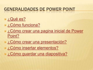 PowerPoint es una aplicación de Microsoft para crear presentaciones utilizando diapositivas con elementos como texto, imágenes y sonido. El documento explica cómo crear una nueva presentación en blanco o con plantilla, insertar diferentes elementos multimedia, y guardar la presentación con un nombre asignado.