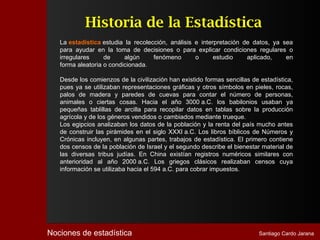 El documento describe la historia y desarrollo de la estadística. Comenzó con registros numéricos simples hace miles de años en civilizaciones como Babilonia y Egipto. Con el tiempo, la estadística se volvió más sofisticada y se utilizó para propósitos como censos y recaudación de impuestos. En el siglo XIX, la estadística se estableció como un método científico para estudiar fenómenos naturales y sociales mediante la reducción de datos a valores numéricos. Hoy en día