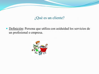 El documento habla sobre los clientes, las quejas y las personas difíciles. Define al cliente como una persona que usa los servicios de una empresa con frecuencia. Explica que existen diferentes tipos de clientes como comunicativos, charlatanes, inseguros o agresivos. Define una queja como la expresión de dolor o sentimiento y los pasos para solucionarla son actuar rápido, pedir disculpas y corregir el error. Finalmente, da consejos para tratar a personas difíciles como escucharlas con calma y agradecerles aunque sea difícil.