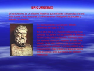 El documento resume tres corrientes filosóficas de la antigua Grecia: el epicureísmo, el estoicismo y el cinismo. El epicureísmo defendía el placer como bien supremo y rechazaba los temores a los dioses y a la muerte. El estoicismo enfatizaba la virtud y el control de las pasiones siguiendo la razón. Los cínicos criticaban la sociedad y promovían una vida simple y natural siguiendo a filósofos como Antístenes y Diógenes.