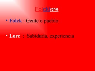 El documento resume el folclore chileno, el cual abarca la sabiduría y cultura del país a través de sus tradiciones y costumbres. El folclore se divide en dos etapas: material e inmaterial. El folclore material incluye las comidas típicas y trajes regionales transmitidos de generación en generación, mientras que el inmaterial comprende los bailes y danzas representativos de cada zona como la cueca, el trote y la resfalosa. También forma parte del folclore los juegos populares practicados en fiestas