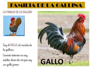 El documento habla sobre las gallinas y los gallos, incluyendo su familia, tipos de gallinas, hábitat, alimentación, utilidad y el nacimiento de un pollo.