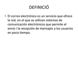 El documento define el correo electrónico, su origen en 1961 y extensión en 1965, e introduce elementos como la dirección de correo, proveedor, mensaje con "Para:", "Asunto:" y contenido, y problemas como el correo spam y su solución de eliminar mensajes desconocidos.