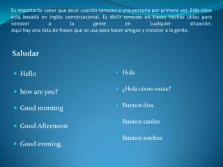 Este documento proporciona una lista de frases útiles en inglés conversacional para conocer a la gente y seguir conversaciones. Incluye saludos comunes, formas de presentarse a uno mismo y a otros, preguntas para seguir conversando sobre de dónde son las personas, qué hacen y más. También incluye frases para invitar a alguien y despedirse. El objetivo es enseñar frases básicas pero útiles para interactuar con hablantes de inglés en diferentes situaciones sociales.