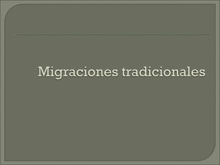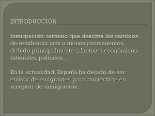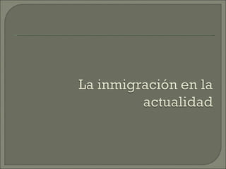 El documento describe los orígenes y tipos de inmigrantes en España. Los inmigrantes proceden principalmente de Europa y son atraídos por el clima y estilo de vida, mientras que los extracomunitarios llegan por razones económicas o políticas y realizan trabajos poco cualificados. Aunque la inmigración trae beneficios, también plantea desafíos como la integración cultural y la explotación laboral.