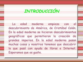 Este documento resume la Edad Moderna, incluyendo el descubrimiento de América por Cristóbal Colón y los grandes imperios que se crearon como resultado. Explica conceptos como el Renacimiento, la monarquía autoritaria en España y los viajes de Colón. También cubre temas como el invento de la imprenta, los primeros conquistadores y el despotismo ilustrado.