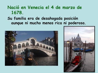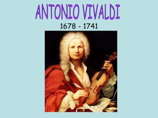 Antonio Vivaldi nació en Venecia en 1678. Estudió música y se ordenó sacerdote a los 25 años, trabajando como maestro de violín en un orfanato donde componía dos conciertos al mes. Se hizo famoso como compositor e intérprete de violín, realizando giras por Italia y Europa. Murió empobrecido en Viena en 1741.