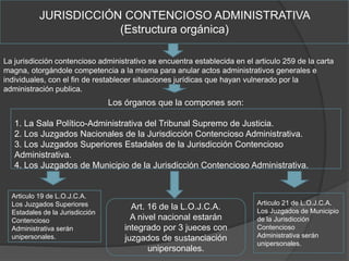 La jurisdicción contencioso administrativa en Venezuela está compuesta por cuatro niveles: 1) La Sala Político-Administrativa del Tribunal Supremo de Justicia, 2) los Juzgados Nacionales de la Jurisdicción Contencioso Administrativa, 3) los Juzgados Superiores Estadales de la Jurisdicción Contencioso Administrativa, y 4) los Juzgados de Municipio de la Jurisdicción Contencioso Administrativa. El documento describe la estructura y competencias de cada uno de estos órganos en el sistema de justicia