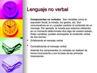 Este documento describe los componentes no verbales de la comunicación, incluyendo la mirada, expresiones faciales, sonrisa, postura, orientación corporal, gestos, movimientos, distancia interpersonal y contacto físico. Explica que estos elementos comunican estados de ánimo y actitudes de forma inconsciente, y son fundamentales para las primeras impresiones y el significado del mensaje verbal.