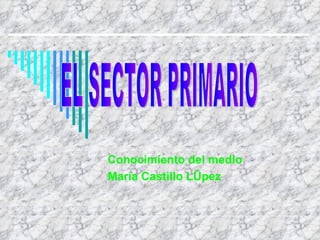 El documento describe el sector primario en la Región de Murcia, España. Incluye la agricultura, ganadería y pesca. La agricultura incluye cultivos de secano como la vid y almendro, y cultivos de regadío como lechugas, melones y tomates. La ganadería se centra en el porcino, ovino y caprino. La pesca se realiza en puertos locales y también incluye acuicultura de atún, dorada y lubina.