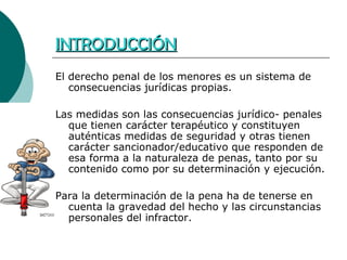 El documento describe el sistema de sanciones en el derecho penal juvenil en España tras la Ley Orgánica 8/2006. No se aplica una sanción predeterminada, sino que la consecuencia se decide considerando factores como la edad del menor, su situación familiar y social, y su interés. Las sanciones pueden incluir medidas terapéuticas, de corrección educativa o penales como internamiento en régimen cerrado, con límites de duración que dependen de la edad y gravedad de los delitos.