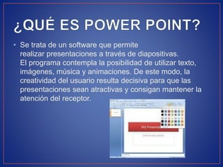 PowerPoint es un software que permite crear presentaciones con diapositivas utilizando texto, imágenes, música y animaciones para transmitir un mensaje de manera atractiva y mantener la atención del público. Cada diapositiva funciona como un lienzo en blanco donde se pueden agregar elementos como texto, imágenes y gráficos para explicar parte de la presentación.