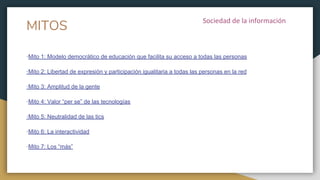 Este documento resume 15 mitos comunes sobre la sociedad de la información y las tecnologías de la información y la comunicación (TIC) en educación. Algunos de estos mitos incluyen que las TIC facilitan un acceso democrático a la educación para todos, que promueven la libertad de expresión y participación igualitaria, y que las tecnologías pueden resolver todos los problemas educativos. Sin embargo, el documento argumenta que la realidad es más matizada, y que factores como la desigualdad digital, la falta de alfabetización digital y