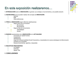 Este documento presenta información sobre innovación e iniciativas innovadoras. Explica definiciones de innovación, tipos de innovación según diferentes clasificaciones, rasgos característicos de la innovación actual, y ejemplos de iniciativas innovadoras como La Fageda, Carbures y Agugu Tata. Concluye que las TIC están transformando las empresas, la innovación impulsa la competitividad, y es importante dotar al sistema laboral y de investigación con mayor flexibilidad y calidad para fomentar la innovación.