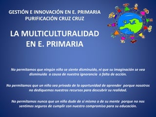 Este documento discute la importancia de la educación multicultural y la necesidad de crear un centro educativo que promueva la aceptación de la diversidad cultural. El centro debe servir como modelo de integración pluralista y capacitar a maestros para que adopten una actitud abierta hacia otras culturas y ayuden a los estudiantes a establecer relaciones positivas sin discriminación.