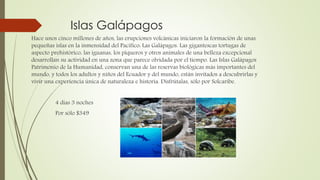 Este documento presenta varios destinos turísticos nacionales e internacionales, incluyendo las Islas Galápagos, Mompiche, Buenos Aires, Cali y Río de Janeiro. Para cada destino, ofrece una breve descripción de sus atracciones y características, así como los detalles de paquetes turísticos de 3 a 5 días con precios que van desde $115 hasta $1340.
