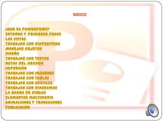 Este documento proporciona una introducción general a Microsoft PowerPoint y sus funciones principales. Explica cómo crear y modificar presentaciones de diapositivas, incluidos objetos de texto, tablas, imágenes, gráficos y otros elementos multimedia. También cubre temas como diseño, animaciones, publicación y entrega de presentaciones. El documento está organizado en secciones con títulos como "Entorno y primeros pasos", "Trabajar con diapositivas", "Trabajar con imágenes", "Animaciones y transiciones" y más.