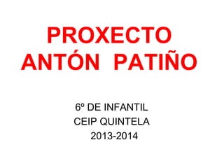 El proyecto de Antón Patiño en CEIP Quintela involucra a los niños de 6º de infantil en una investigación sobre el artista, pidiendo la colaboración de las familias. Los estudiantes recopilan información, realizan recreaciones de sus obras y crean un libro al inventar historias basadas en los cuadros seleccionados. El proceso incluye actividades como pintura, medición y organización de datos, fomentando la creatividad y el trabajo en equipo.