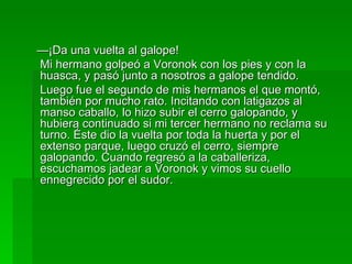 El resumen describe la historia de un anciano de 90 años llamado Pimen Timofeich que vive en una granja con su nieto. A pesar de su edad avanzada, camina encorvado y con dificultad apoyándose en un bastón. Los niños de la granja disfrutan cabalgando al caballo manso Voronok, aunque éste también está viejo. Un día, uno de los niños azota fuertemente a Voronok cuando se niega a moverse, rompiendo la fusta en su cabeza.
