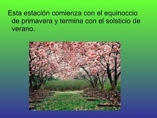 La primavera es la estación de transición entre el invierno y el verano, comenzando con el equinoccio de primavera y terminando con el solsticio de verano, y se presenta en las zonas templadas como una representación de la juventud en la literatura.