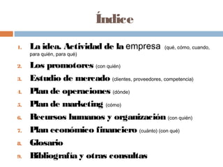 Este documento presenta una guía para crear un proyecto empresarial desde la idea inicial hasta el plan de negocio completo. Explica los nueve pasos clave que incluyen definir la idea de negocio, estudiar el mercado, elaborar planes de operaciones, marketing, recursos humanos y finanzas, y proporciona ejemplos e instrucciones detalladas para cada paso. El objetivo es ayudar a los emprendedores a desarrollar un proyecto empresarial sólido y viable.