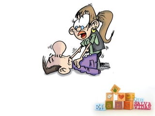 Este documento proporciona información sobre la reanimación cardiopulmonar (RCP) y cómo realizarla correctamente. Explica que la RCP incluye masaje cardíaco y ventilación para sustituir la circulación y respiración cuando alguien sufre una parada cardiorrespiratoria. Detalla los pasos para realizar el masaje cardíaco de forma efectiva, así como la ventilación boca a boca, y enfatiza la importancia de comenzar la RCP lo antes posible para mantener con vida el cerebro y otros órganos hasta la