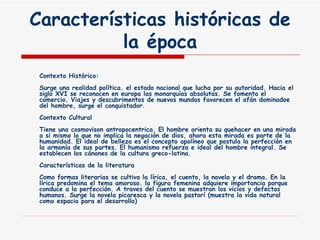 El documento resume las características históricas, culturales y literarias del Renacimiento. Culturalmente se enfatiza al hombre como centro del universo. En literatura se cultivan la lírica, el cuento, la novela y el drama, abordando temas amorosos. La poesía se enfoca en el amor no correspondido y usa tópicos literarios. El teatro incluye temas más laicos. La prosa didáctica difunde las nuevas ideas.