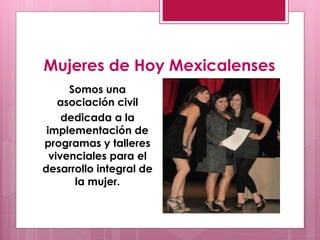 El documento describe un taller de resiliencia ofrecido por la asociación civil Mujeres de Hoy Mexicalenses. El taller tiene como objetivo enseñar las claves para llevar una vida resiliente y demostrar cómo aplicarlas en la vida cotidiana. Se dividirá en 12 sesiones que cubrirán temas como autonomía, manejo del estrés, comunicación y autodisciplina. Se ofrecerán dos grupos del taller con diferentes fechas y expositores.