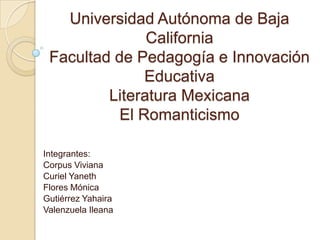 El documento resume el movimiento romántico en México. Se divide en tres etapas: la de la Independencia, caracterizada por la libertad de expresión; la Academia de Letrán, que promovió la literatura nacional; y el Liceo Hidalgo, donde se debatían obras literarias. Manuela Acuña y Esteban Echeverría fueron importantes exponentes románticos mexicanos. El romanticismo en México se distinguió por el periodismo, la política y el positivismo.