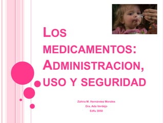 Este documento describe los diferentes aspectos relacionados con los medicamentos, incluyendo su definición, formas farmacéuticas, vías de administración, etiquetado, almacenamiento, y procedimientos para administrarlos de forma segura a niños. Explica en detalle cada una de las 8 vías de administración (oftálmica, ótica, nasal, oral, tópica, parenteral, rectal y vaginal) y los pasos a seguir en cada caso. También destaca la importancia de seguir las instrucciones médicas, etiquetado, fechas