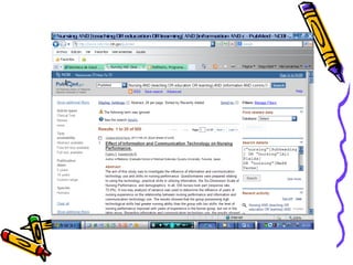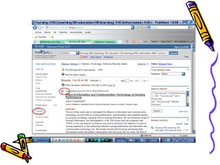 El documento describe los pasos para realizar una búsqueda bibliográfica de 5 artículos sobre el tema de las nuevas tecnologías de la información y la comunicación en la docencia de enfermería utilizando la base de datos PubMed. Estos pasos incluyen consultar términos clave en inglés en DeCS, introducir las palabras clave estratégicamente en el buscador de PubMed, aplicar filtros para ajustar los resultados al tema, seleccionar 5 artículos relevantes y agregarlos a RefWorks con formato Van Couver.