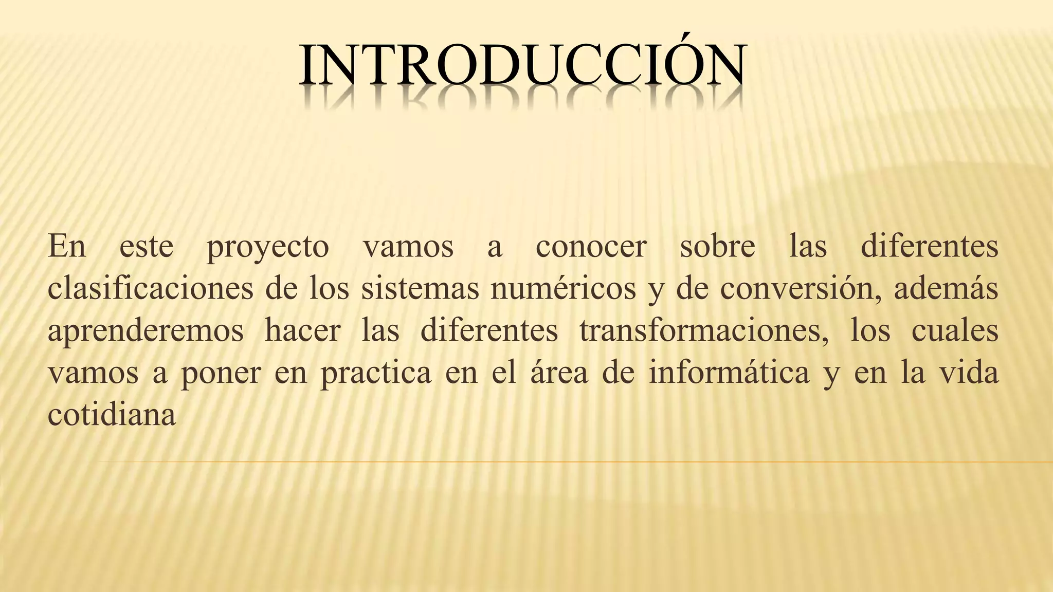 Este documento describe diferentes sistemas numéricos y de conversión. Explica que los sistemas numéricos se clasifican en posicionales y no posicionales. Luego describe los sistemas decimal, binario, octal y hexadecimal, incluyendo sus bases y cómo representan los números. Finalmente, muestra ejemplos de cómo convertir entre estos sistemas numéricos, como convertir decimal a binario, octal a hexadecimal, y binario a decimal. El objetivo es comprender estos sistemas numéricos y aprender a realizar conversiones entre ellos.