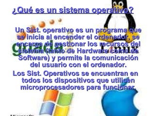 Un sistema operativo es un programa que gestiona los recursos del hardware y software de un dispositivo y permite la interacción entre el usuario y la máquina. Los sistemas operativos administran recursos, archivos, tareas y proporcionan interfaces de usuario. Los sistemas operativos más populares son versiones de Windows, Mac OS y Linux.