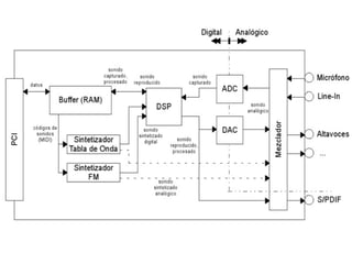 El documento detalla las tarjetas de video y sonido, explicando sus funciones, historia y componentes. Se centra en la evolución de las tarjetas gráficas desde su creación en los años 60, el desarrollo de GPUs, y los métodos de refrigeración y conexión disponibles. Además, describe cómo las tarjetas de sonido transforman señales acústicas y los elementos esenciales que las componen.