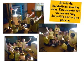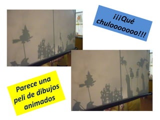 Los estudiantes inventaron dos historias y las representaron con sombras chinas utilizando personajes como un príncipe, princesa, rey, dragón y hada. Después de ensayar las historias, las presentaron ante la clase logrando grandes efectos con las sombras y recibiendo aplausos del público al final.