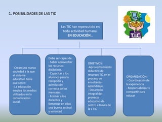 Este documento describe las posibilidades y roles de las TIC en la educación. Brevemente: 1) Las TIC han impactado todas las áreas incluyendo la educación. 2) Los profesores deben ser creativos y orientadores, mientras los estudiantes deben ser más críticos y autónomos. 3) Tanto profesores como estudiantes deben aprender habilidades digitales aunque existen riesgos como la distracción.