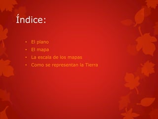 Este documento trata sobre las formas de representar la Tierra. Explica que los planos muestran ubicaciones a escala reducida desde una perspectiva aérea, mientras que los mapas representan territorios extensos de la superficie terrestre a escala para proporcionar información geográfica. También define la escala de los mapas como la relación entre la longitud medida en el mapa y la longitud real, y señala que para estudiar la superficie del planeta se usan globos terraqueos y mapamundis.