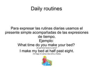 Este documento proporciona información sobre las rutinas diarias y el uso del presente simple en inglés. Explica cómo expresar las actividades cotidianas como levantarse, vestirse, ir a la escuela y hacer los deberes, además de incluir vocabulario sobre el clima y las horas. También ofrece ejemplos de oraciones que describen las rutinas de una persona y las preguntas correspondientes en el presente simple.