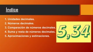 Este documento trata sobre números decimales y operaciones con ellos. Explica las unidades decimales como décimas y centésimas, cómo leer y comparar números decimales, y cómo realizar sumas y restas alineando las cifras decimales de igual orden. También menciona aproximaciones y estimaciones de números decimales.