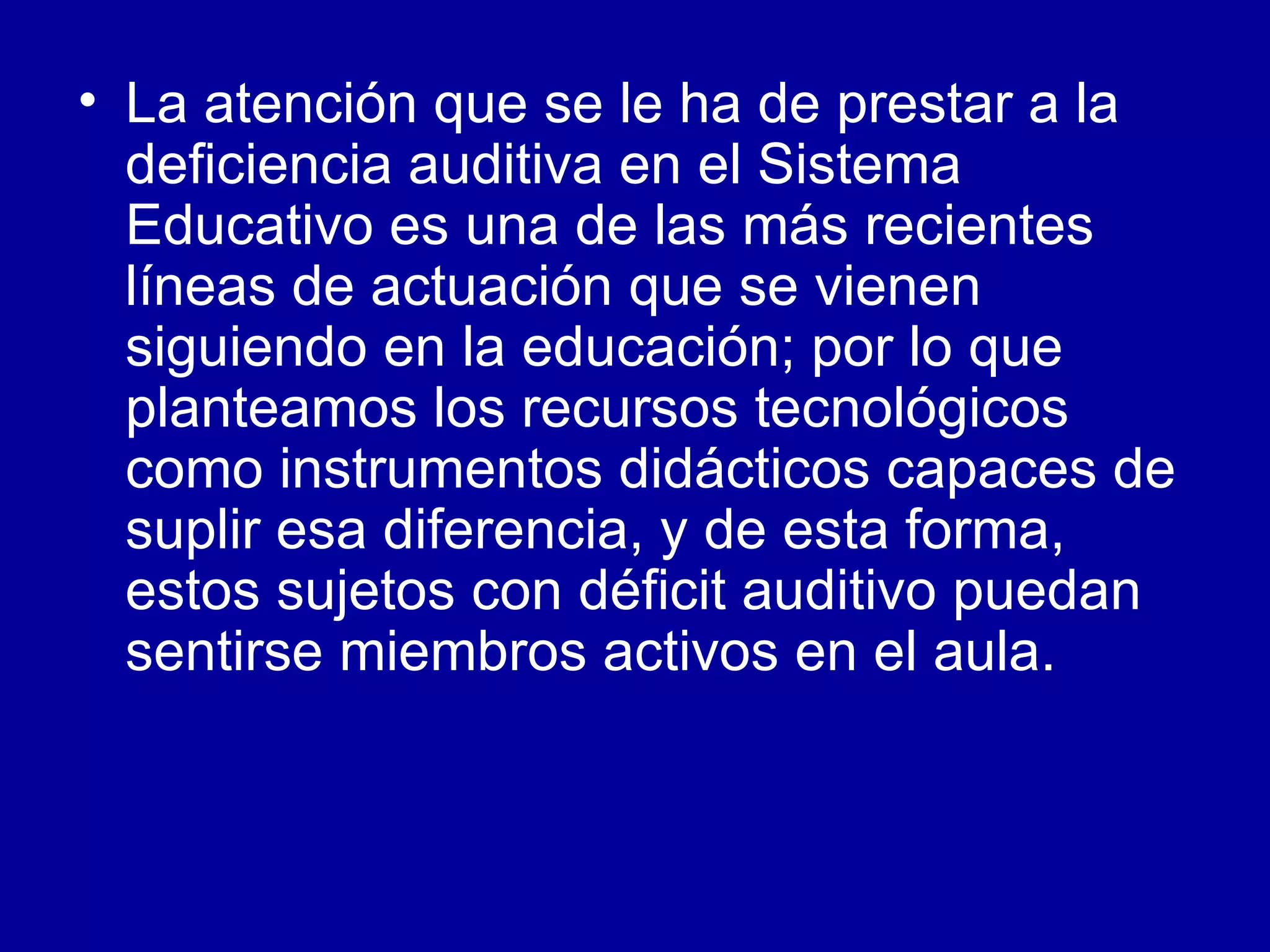 El documento discute el uso de nuevas tecnologías para brindar una educación igualitaria a los estudiantes con deficiencia auditiva. Explica que la atención a la deficiencia auditiva en el sistema educativo es una prioridad reciente y que los recursos tecnológicos pueden suplir esta diferencia para que estos estudiantes se sientan parte activa del aula. También describe que las nuevas tecnologías pueden ofrecer a estos estudiantes el mismo acceso a la educación y que es importante seguir el mismo proceso educativo para los niños con