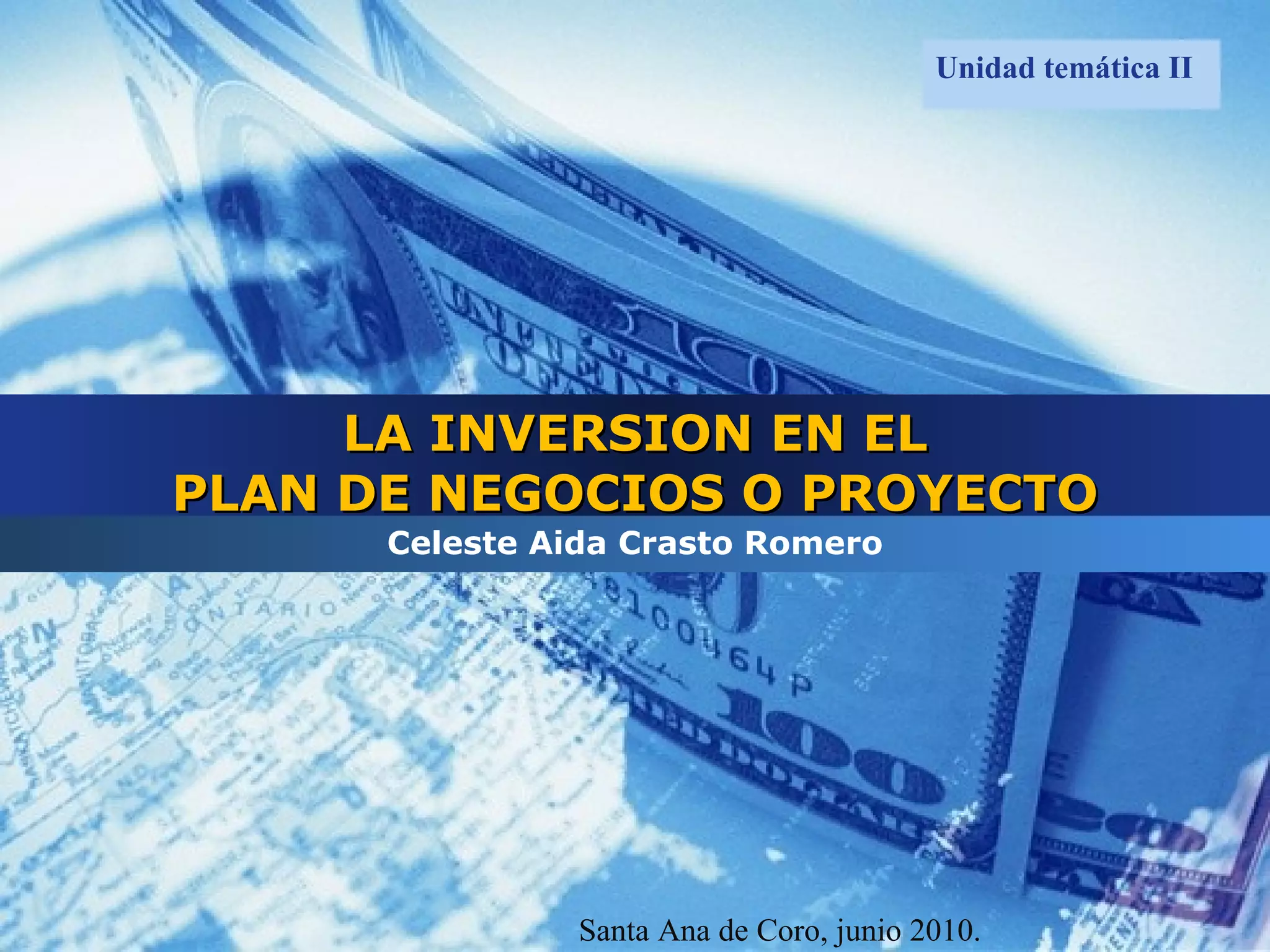 El documento resume los conceptos clave relacionados con la inversión en un plan de negocios o proyecto. Explica que la inversión incluye los recursos necesarios para establecer y poner en marcha el proyecto, y se clasifica en inversión fija, circulante e intangible. También cubre el cálculo de las inversiones, los métodos de financiamiento, los estados financieros proforma y el punto de equilibrio.