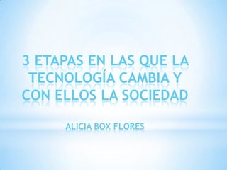 El documento describe 3 etapas en las que la tecnología ha cambiado la sociedad: 1) Fordismo (1910-1960) centrado en la producción masiva; 2) Postfordismo (1970-1990) con diversificación de productos; y 3) Sociedad de la información (1990-presente) donde priman las ideas, la creatividad y las relaciones menos limitadas por el espacio y tiempo. También analiza cómo estos cambios influyen en el trabajo de los maestros, quienes deben fomentar la curiosidad, la innovación y prepararse para hacer un uso posit