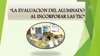 El documento describe diferentes formas en que las TIC pueden integrarse en la evaluación de los estudiantes. La evaluación con TIC permite que los estudiantes se autocorrijan, accedan a las tareas en línea en cualquier momento, y reciban comentarios en tiempo real. También permite la coevaluación y autoevaluación de los estudiantes, así como criterios claros de evaluación como el cumplimiento de tareas y la participación.