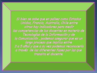 El documento analiza la integración de tecnologías de la información y la comunicación (TIC) en la educación, destacando su rol en la reforma curricular y la creación de nuevas pedagogías. Se identifican diversas etapas de integración de las TIC y se concluye que su uso se centra en el área de lengua, promoviendo el acceso a la literatura universal infantil a través de diferentes formatos. Se enfatiza la necesidad de que los docentes desarrollen competencias digitales para implementar efectivamente estas tecnologías.