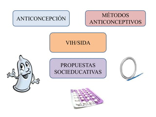 Este documento resume varios métodos anticonceptivos como preservativos, diafragmas, píldoras anticonceptivas, ligadura de trompas y DIU. También explica qué es el VIH/SIDA, cómo se transmite principalmente a través de relaciones sexuales sin protección o compartir agujas, y la importancia de hacerse pruebas y prevenirlo. Por último, propone educación, concienciación y sensibilización como propuestas socioeducativas para prevenir el VIH/SIDA.