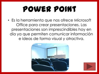 Este documento describe las herramientas PowerPoint y Prezi para crear presentaciones. PowerPoint permite crear diapositivas con texto, gráficos y videos para proyectar o imprimir. Prezi es una aplicación online similar pero trabaja en un lienzo único en lugar de diapositivas, permitiendo zoom in/out. Ambas herramientas siguen reglas como simplicidad, contraste de colores e imágenes para hacer las presentaciones atractivas y efectivas.