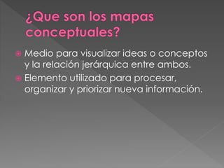 El mapa conceptual es una herramienta que permite visualizar ideas y conceptos y sus relaciones jerárquicas. Se compone de nodos que contienen conceptos unidos por líneas, y enlaces que establecen proposiciones entre los conceptos. Tiene relación con el aprendizaje significativo al permitir organizar y relacionar información nueva.