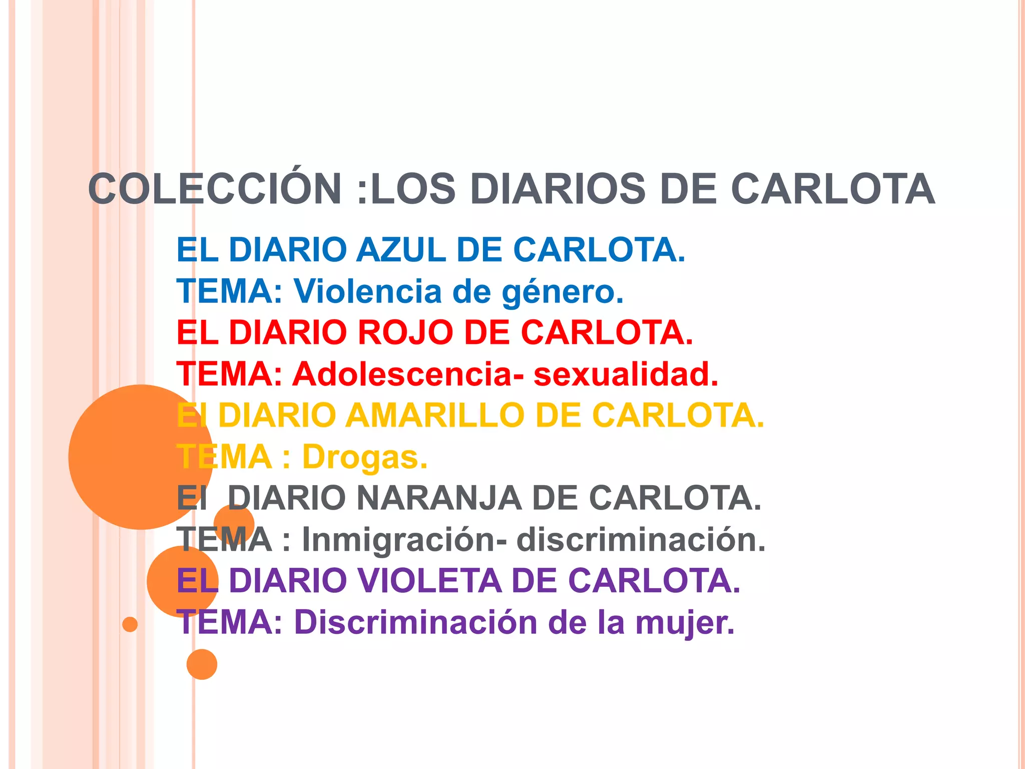 El documento presenta una colección de diarios escritos por Carlota sobre diferentes temas sociales como la violencia de género, la sexualidad adolescente, las drogas, la inmigración y la discriminación de la mujer. Cada diario, identificado por un color, explora estas problemáticas a través de las anotaciones y experiencias de Carlota así como la información y testimonios recogidos de otras personas.